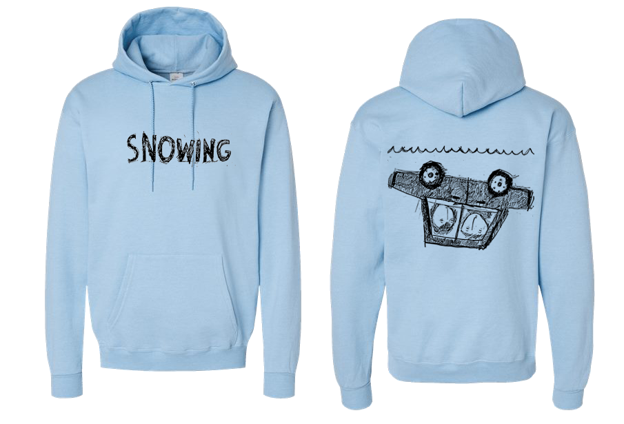Front & back print in black ink on a light blue Hanes pullover.